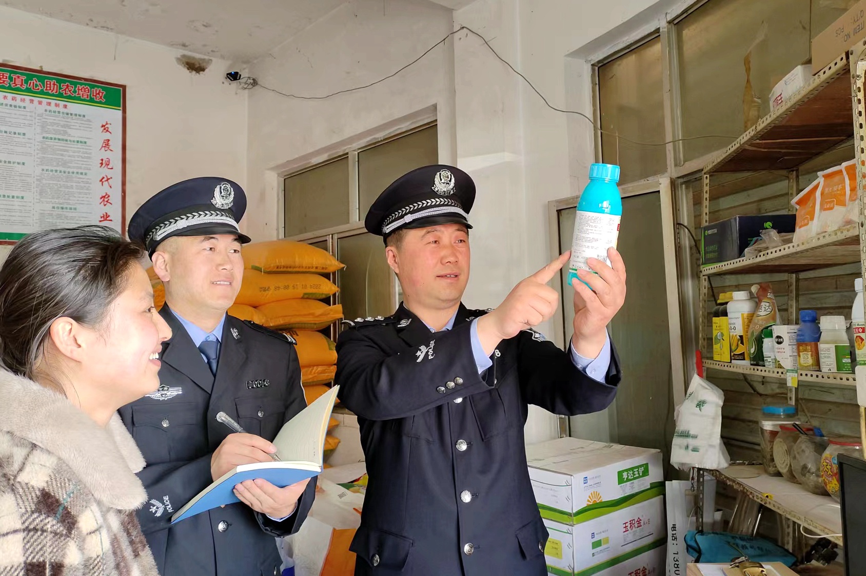 灵台县公安局龙门派出所联合市场监管所等单位对辖区农资经营场所进行例行检查(灵台县公安局供图)